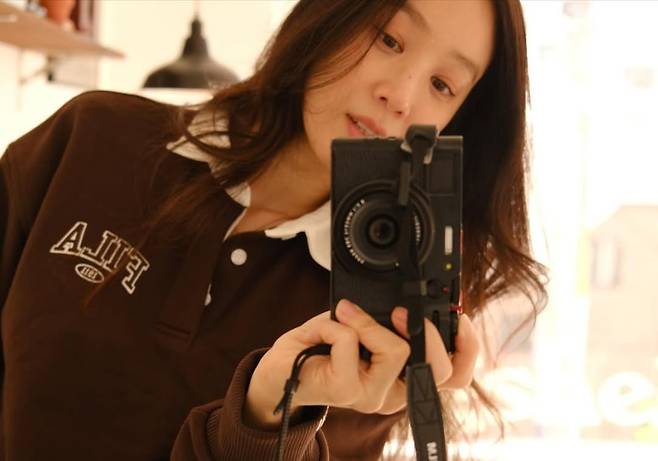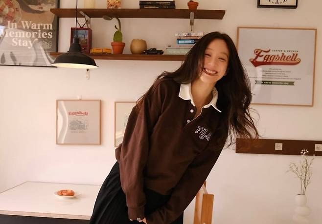 빈티지한 감성이 가득한 카페, 정려원의 환한 미소가 공간을 더욱 따뜻하게 만든다. 편안한 실루엣의 초코 브라운 럭비 맨투맨에 자연스럽게 흐르는 긴 머리!