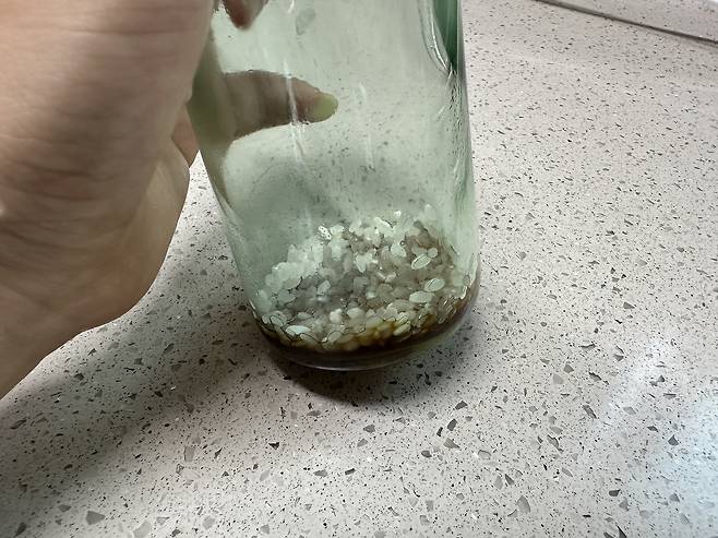 생쌀을 기름병 안에 넣어주시면 되는데요. 이렇게 하면 세척 솔을 사용하지 않아도 깨끗하게 남아있는 기름을 제거할 수 있어요!