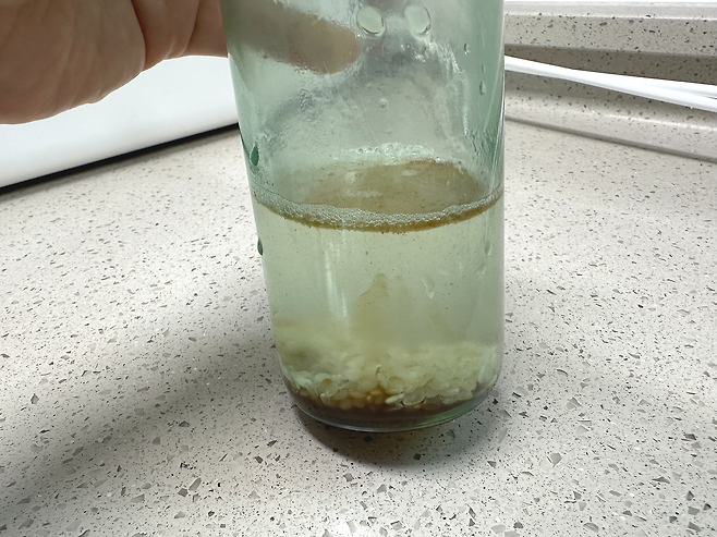 쌀을 넣은 기름병 안에 뜨거운 물을 120ml 정도 넣어주고 사정없이 흔들어주세요.