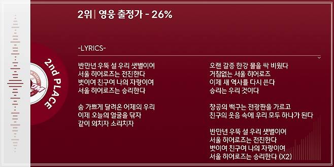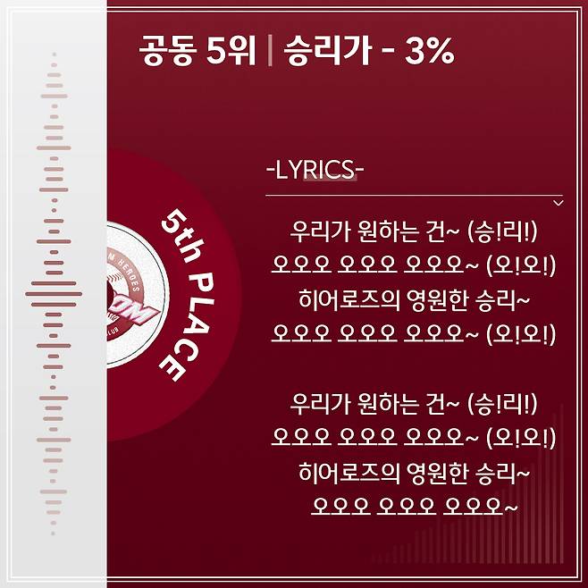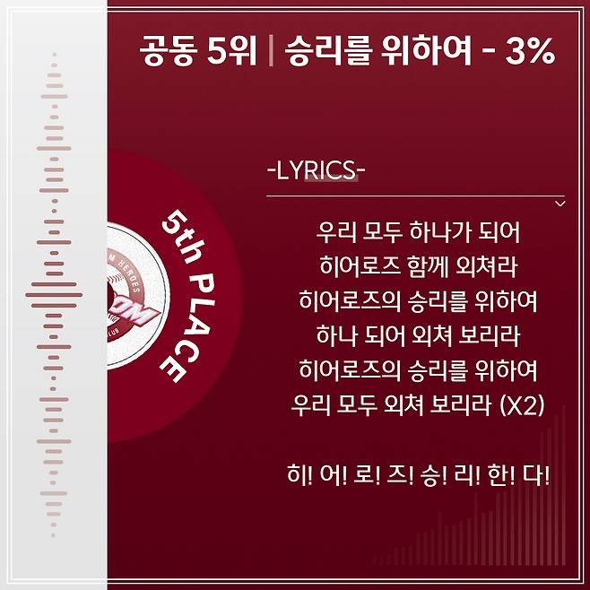 ‘우리가 원하는 건~ 승리!’라는 가사로 잘 알려진 ‘승리가’가 공동 5위에 이름을 올렸다. 미국 민요인 ‘Red River Valley’가 원곡인 이 노래는 현대 유니콘스 시절의 응원가를 물려받아 지금까지 사용 중이다. 간단한 가사와 중독성 있는 멜로디를 듣고 있노라면 자신도 모르게 이 노래를 흥얼거리는 자기 자신을 발견할 수 있을 테다. 비록 표를 많이 얻지는 못했지만, 지금은 추억으로 남은 목동야구장 시절의 히어로즈와 함께 한 팬들에게는 결코 잊을 수 없는 대표 응원가임에는 분명하다.