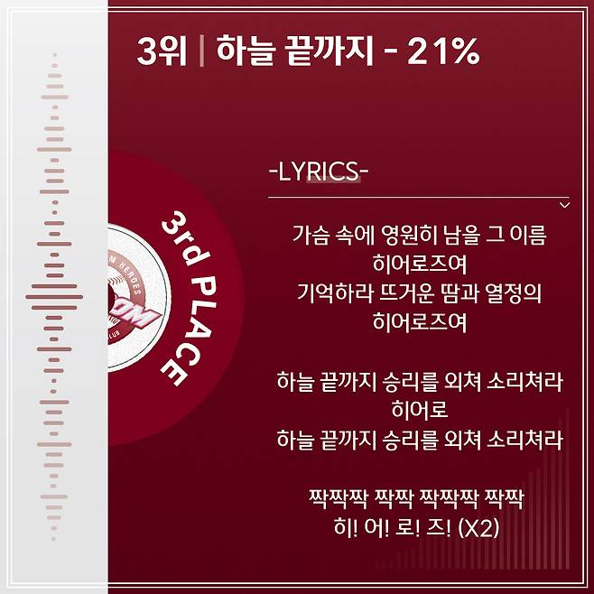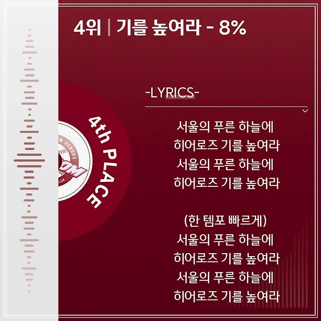 제목부터 비장함을 자랑하는 ‘영웅 출정가’가 두 번째로 높은 순위를 기록했다. 밴드 ‘크라잉넛’이 히어로즈를 위해 헌정한 곡으로, 팬들에게 ‘큠뽕’을 선사하며 상당한 지지를 얻고 있는 응원가다. 영웅군단이라는 별칭에 딱 어울리는 가사를 듣고 있으면, 수많은 전사가 거칠 것 없는 기세로 달려가는 모습이 연상된다. 마치 그들 앞을 가로막을 것은 아무것도 없을 것처럼 말이다. 게다가 히어로즈가 창단했을 때 처음 만들어진 곡인 만큼 그 상징성 또한 엄청나니, 이 노래에 감히 ‘히어로즈 No. 1 공식 응원가’라는 칭호를 붙여도 과언이 아니겠다.