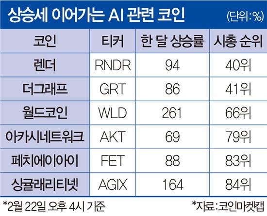 이 밖에도 사물인터넷 기기 같은 하드웨어와 AI를 연결한 집단 학습을 추구하는 페치에이아이(FET), 미사용 컴퓨팅 파워를 제공하고 보상을 받는 아카시네트워크(AKT), AI 개발자들이 저마다 AI 모델을 개방형 마켓에 공유하고 거래할 수 있도록 돕는 싱귤래리티넷(AGIX) 등도 대표적인 AI 코인으로 꼽힌다.