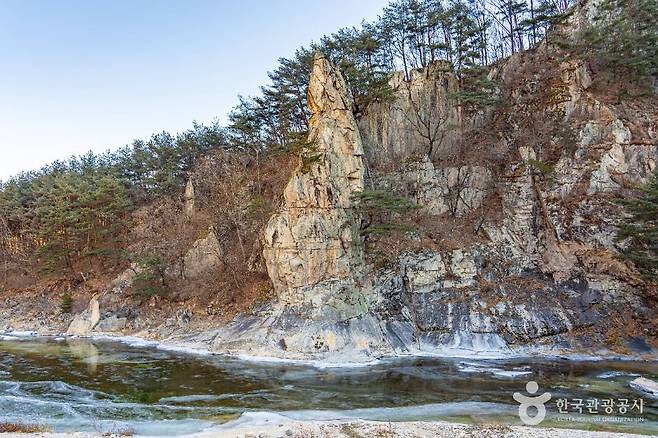 선바위는 물가에서 곧게 솟아 있는 독특한 형태의 바위입니다. 아래에서 보면 마치 사람이 계곡을 지키듯 서 있는 모습이고, 위쪽에서 내려다보면 하늘을 향해 치솟은 불꽃이나 날카로운 칼날을 연상하게 합니다.