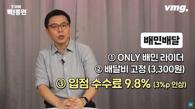 기자가 배민 측에 물으니 경쟁사인 '쿠팡이츠'때문이란 답이 돌아왔다. 원래부터 수수료가 9.8%였던 쿠팡이츠 수준으로 수수료를 올렸다는 것이다. 그 3%p 차이만큼 수익의 차이가 나면서 딱 그 3%p 차이만큼 할인쿠폰 같은 프로모션을 하지 못하는 상황이 이어졌고, 이를 극복하기 위해 쿠팡이츠의 수수료를 따라갈 수밖에 없었다고 설명했다.
