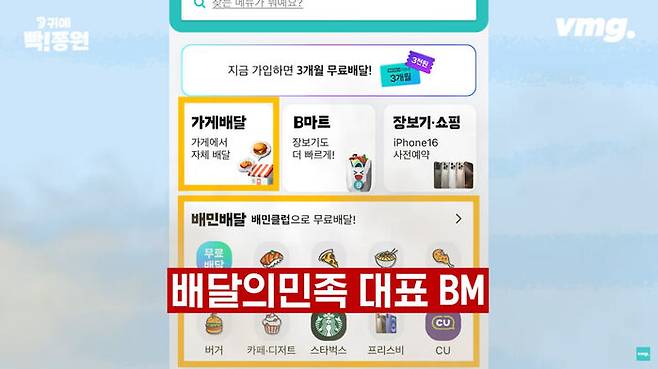 먼저 우리나라 시장 점유율 60%에 육박하는 '배달의민족' 사업 모델을 살펴보자. 배달의민족 앱을 켜고 들어가면 가장 크게 눈에 잘 보이는 곳에 위치한 메뉴가 있다. 바로 '배민배달'이다. 이 배민배달 위쪽으로 보면 정사각형 작은 모양으로 '가게배달'이라고 보인다. 바로 이 '배민배달'과 '가게배달'이 배민이 내세우고 있는 두 가지 주요 상품이다. 내가 음식점을 차려 배달의민족에 내 가게를 올려놓는다면, 이 '배민배달' 혹은 '가게배달' 둘 중의 하나의 상품을 선택해 비용을 내야 한다. (물론 두 개 다 가입하는 사장님도 많다.)