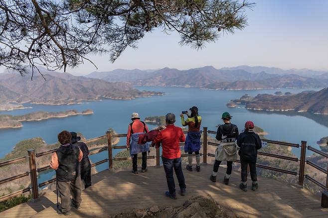 탐방로를 따라 약 40분 정도 오르면 드디어 악어봉 전망대가 모습을 드러냅니다. 이곳에 도착하는 순간, 눈앞에 펼쳐지는 풍경은 생각보다 훨씬 더 압도적입니다. 특히 충주호를 중심으로 펼쳐진 산 능선은 자연이 만들어낸 예술 작품처럼 보입니다. 그래서 많은 분들이 이곳에서 한참을 머물며 풍경을 감상하게 됩니다. 무엇보다도 사진으로 담기 어려울 정도로 넓고 깊은 풍경이기 때문에 직접 눈으로 보는 것이 훨씬 더 인상적입니다.