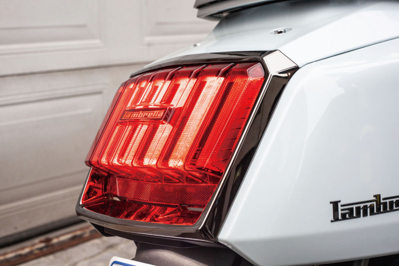 기존의 V125, 200이나 G350이 클래식의 복각에 초점을 맞춘 모델이라면 X300은 람브레타의 새로운 미래를 제시하는 모델이다. 방패 모양의 프런트와 차체에 고정된 프런트 펜더 등 람브레타 특유의 디자인 요소는 그대로 살리고 있다. 차체가 프레임이 되는 모노코크 구조도 그대로다. 하지만 모든 선을 직선으로 새롭게 그어주고 디테일은 과거와 현대를 잘 버무렸다. 특히 후면을 전부 뒤덮고 있는 과감한 디자인의 테일램프는 꽤 근사하게 느껴진다. 테일램프의 7줄 세로 패턴은 핸들바와 센터플로어 등 차량 곳곳에 동일하게 연출되어 통일감을 주고 있다. 전반적으로 외형의 만족도가 상당히 높았다. 기존의 클래식 스쿠터의 섬세하고 여린 이미지보다는 조금 더 터프하고 선 굵은 느낌이 마음에 든다. 람브레타 스쿠터들에게서 공통적으로 느껴지던 남성미가 X300와서 폭발한 느낌이랄까? 과거와 미래를 잇는 쿨한 스타일이 정말 마음에 들었다. 자석을 들고 붙여보니 자석이 붙는 부분은 사이드패널과 전면 방패패널, 그리고 측면의 프레임을 구성하는 부분이다. 철재와 플라스틱을 적절히 배치했는데 도색 품질이 일정해서 전체적인 조화가 좋은 점은 잘 만든 부분이다.