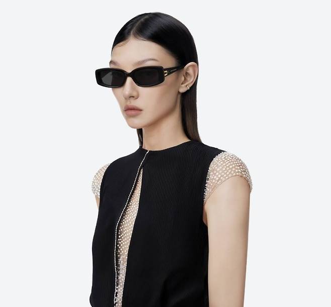 컬러는 그레이, 핑크, 화이트, 블랙 네 가지로 출시되었는데요. 그녀의 픽은 단연 세련되고 모던한 블랙 컬러였습니다. 선글라스 옆면의 금색 장식은 고급스러운 디테일을 더해주죠. 올블랙 컬러에 도톰하고 청키한 사각 프레임은 시크하면서도 유니크한 매력을 뽐냅니다. 쉽게 소화하기 힘든 디자인이지만, 찰떡같이 소화하면 그야말로 ‘힙’ 그 자체!