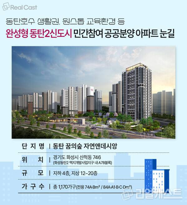 ‘동탄 꿈의숲 자연앤데시앙’은 동탄2신도시 A78블록에 지하 4층~지상 최고 20층, 12개 동, 전용면적 74·84㎡ 총 1,170가구 규모로 들어서는 대규모 브랜드 아파트 입니다.