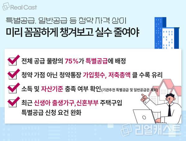 - 특별공급 물량 전체의 85%로 자격 잘 따져 접근하면 당첨기회 높아