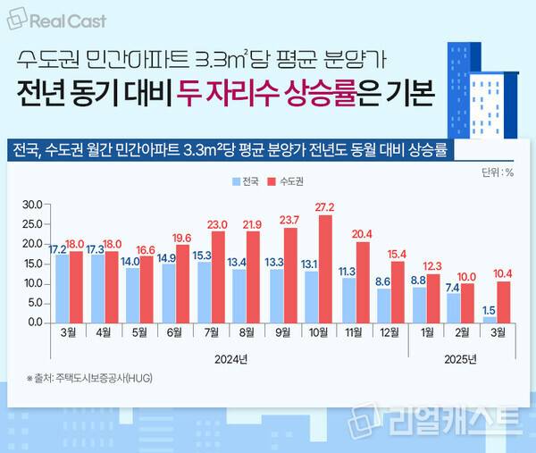 주택도시보증공사(HUG)에 따르면 3월 수도권 민간 아파트 3.3㎡당 평균 분양가는 2,837만원으로 지난해 같은 달(2,438만원) 대비 10.4% 상승했습니다. 상승금액이 398만원 이니까 전용 84㎡(구 34평)을 분양 받는다고 가정하면 1억3,532만원을 더 주고 분양을 받는 셈입니다.
