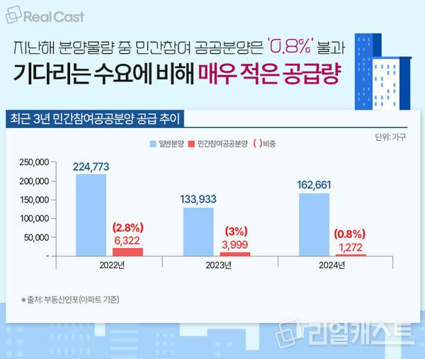 부동산인포에 따르면 2022년에는 전체 분양 물량(임대, 사전청약 제외)의 2.8%(6,300여 가구) 정도만이 민간참여 공공분양 물량이었습니다. 2023년에도 3%(약 4,000여 가구) 정도가 공급이 됐는데 지난해는 이보다 더 줄어들어 전체 분양 가구의 0.8% 수준인 약 1,300여 가구(1,272가구)가 분양하는데 그쳤습니다.