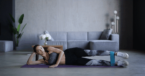 오른쪽 측면을 옆으로 대고 매트에 눕습니다. 오른손으로 머리를 지탱하며 상체를 안정적으로 유지합니다. 왼쪽 다리를 공중으로 올렸다가 천천히 내립니다. 반대편으로 눕고, 오른쪽 다리로 운동하세요.