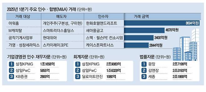 국내 인수·합병(M&A) 시장이 정치 리스크, 경기 침체 등으로 인해 올해 1분기 극심한 침체를 겪었다. 조 단위 빅딜이 실종된 가운데 국내 회계법인인 삼정KPMG가 중견 거래를 주도하며 기업경영권 인수(바이아웃) 재무자문과 회계자문 부문에서 2관왕을 차지했다.