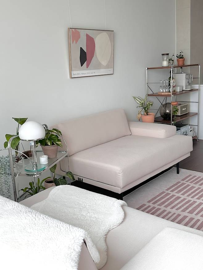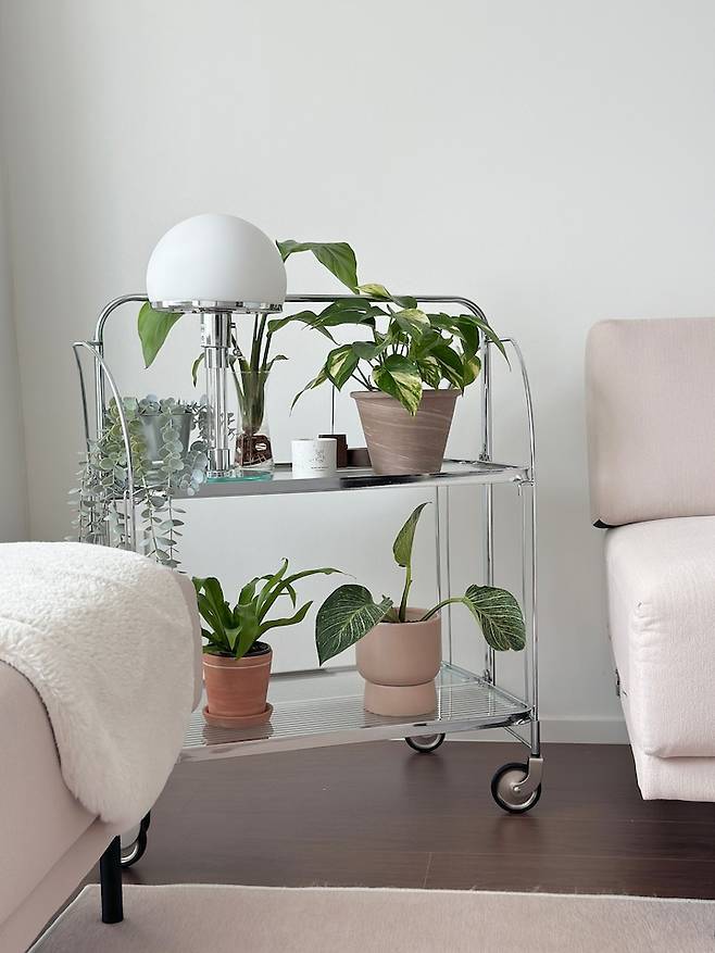 소파 사이에는 트롤리를 두고 식물들을 키우고 있어요. 필요할 때마다 트롤리를 이동시켜 물주러 가면 되고, 협탁 역할도 해줘서 잘 쓰고 있습니다.