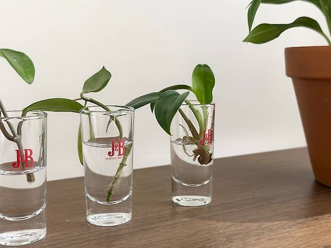 몇 가지 식물은 삽수를 위스키 잔에 물꽂이 해주고 있는데요, 뿌리 나오는 게 보이면 참 신기하고 재미있어요.