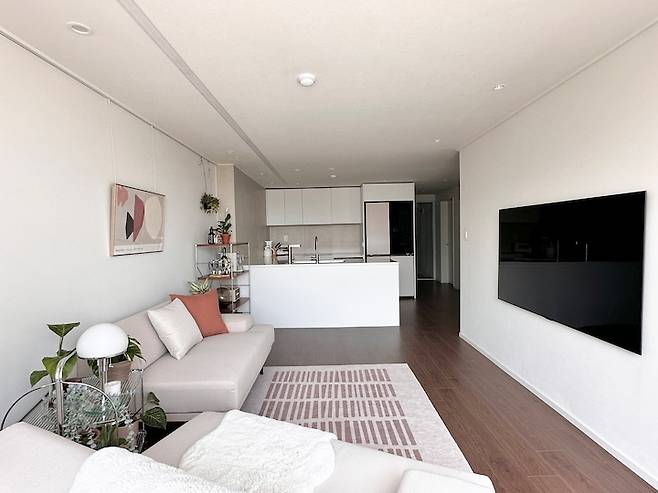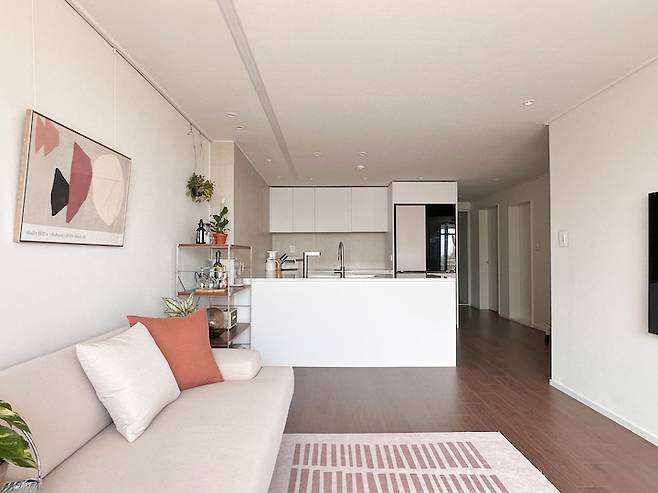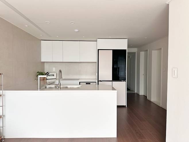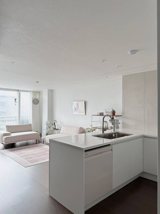 거실에서 주방을 바라본 모습입니다. 원래는 싱크대 앞에 원형 테이블을 두고 다이닝 공간으로 꾸밀까 생각했었는데요.