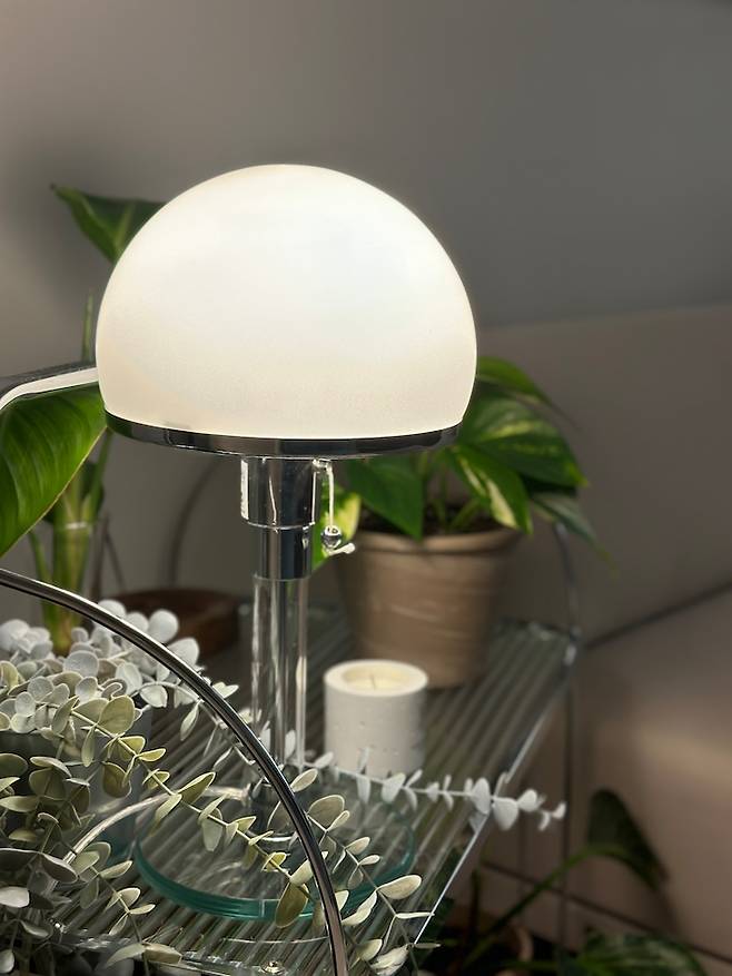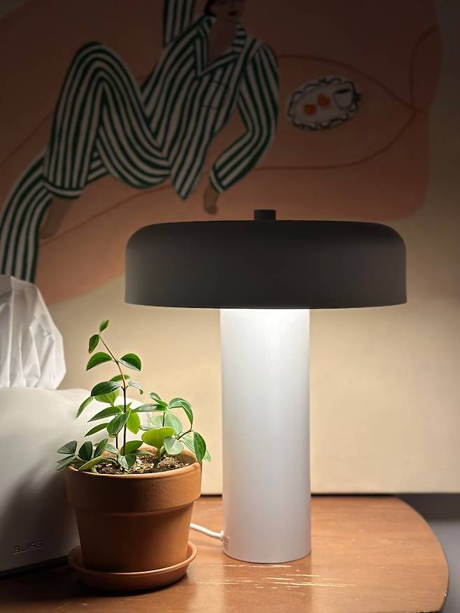 협탁에는 식물을 가져다 두면 보기에도 예쁘고 공기 정화 효과도 있어서 자주 갖다두고 있어요. 이 조명은 당근으로 데려왔는데 쉐입이 독특해서 마음에 듭니다.