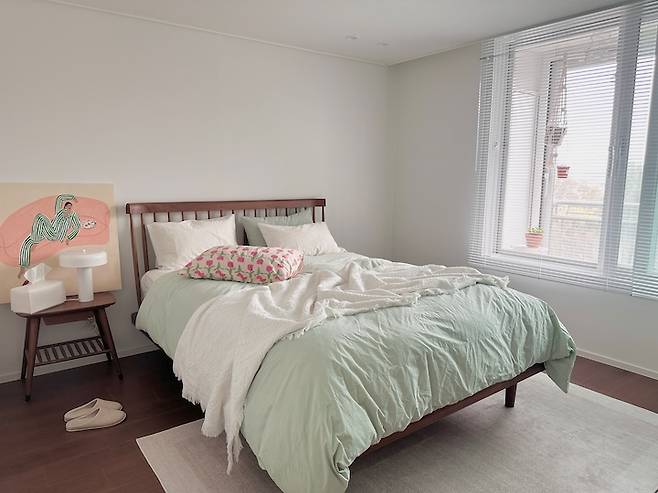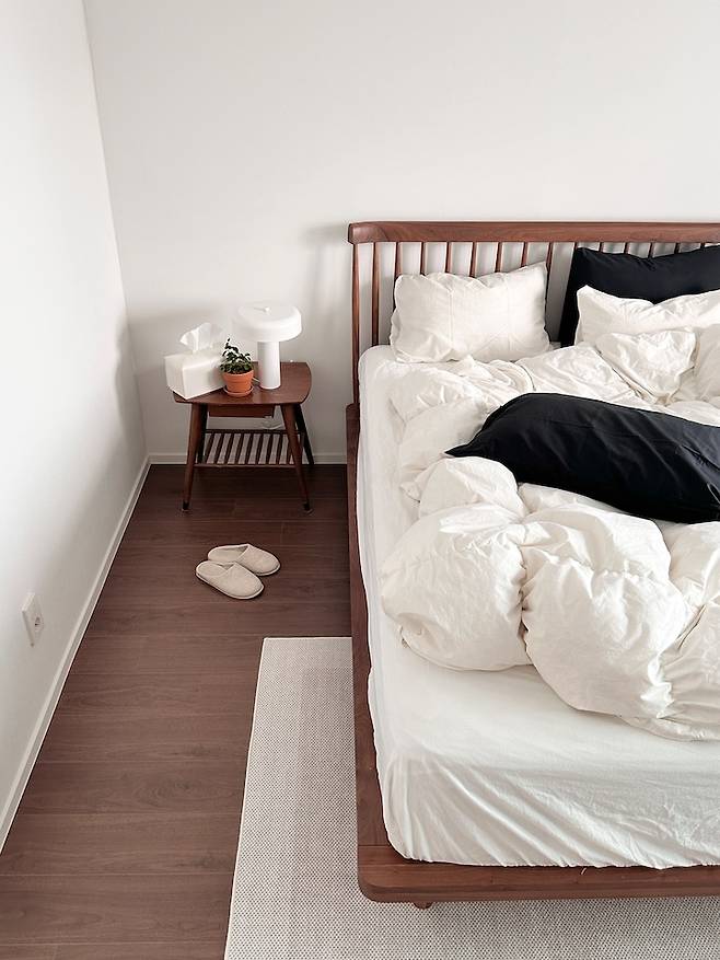 저희 집 침실입니다. 침대 아래에는 러그를 깔아 침대 영역을 구분 짓고 따뜻한 느낌을 내주었습니다. 침대는 북미산 월넛 퀸 사이즈 프레임을 사용 중이고 5년 정도 사용했어요. 잘 쓰고 있지만 다시 구입한다면 라지 킹으로 선택하고 싶어요.