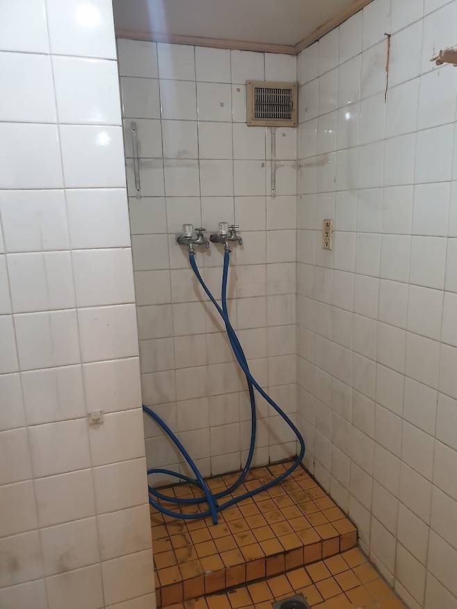 샤워 공간인데요, 2년 정도 사용한 상태라 타일 메지 여기저기 사용감이 보이네요 ㅠ
