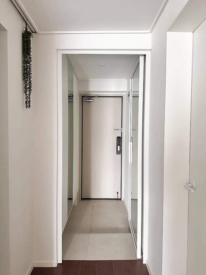 이곳은 안방, 거실로 이어지는 통로라 어수선해 보일 수 있을 것 같아서 아무것도 두지 않고 여백으로 두었어요. 저희 집에서 티비 벽 다음으로 미니멀한 곳이에요.