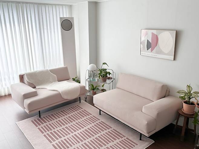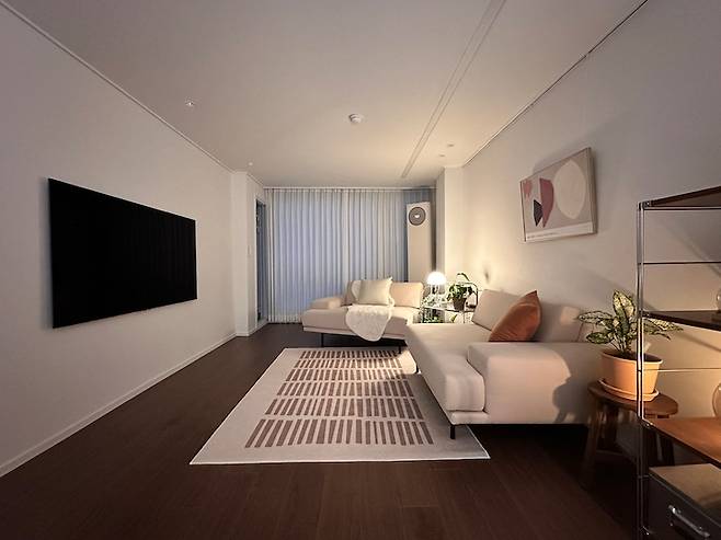 마루 색상이 어둡다 보니 거실을 넓어 보이게 하기 위해서 등받이가 낮은 바이헤이데이 멀티 소파를 선택했습니다. 발품, 손품을 많이 팔았고 쇼룸에 방문해서 실제로 앉아보고 골랐어요. 와이드 버전이라 깊이도 깊어서 편해요.
