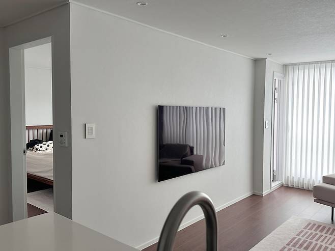 주방에서 티비 쪽을 바라 보았을 때 모습입니다. 저희 집에서 미니멀하려고 노력하는 공간들이 있는데 거실 벽면이 그 중 하나에요.