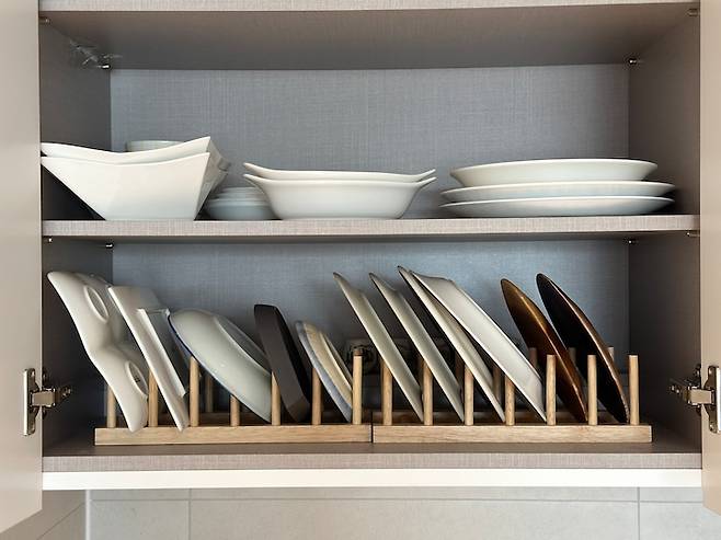 그릇은 사은품으로 받은 것 위주로 소량만 구비하고 있고 자주 쓰는 것들은 꺼내기 편하게 서랍에 수납 중입니다.