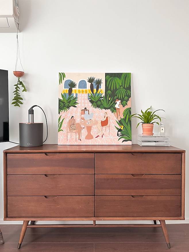 다리가 일자가 아닌 사선으로 떨어지는 게 매력적이어서 마음에 들었던 가구입니다. 오래 사용해서 여기저기 까지고 사용감이 있지만 그런대로 빈티지한 느낌이 들어서 좋아요. 커다란 원형 거울을 두고 화장대 겸용으로 쓰고 있었는데 깨져서 버린 뒤로는 그림을 두고 지내고 있습니다.