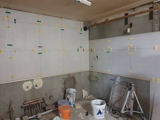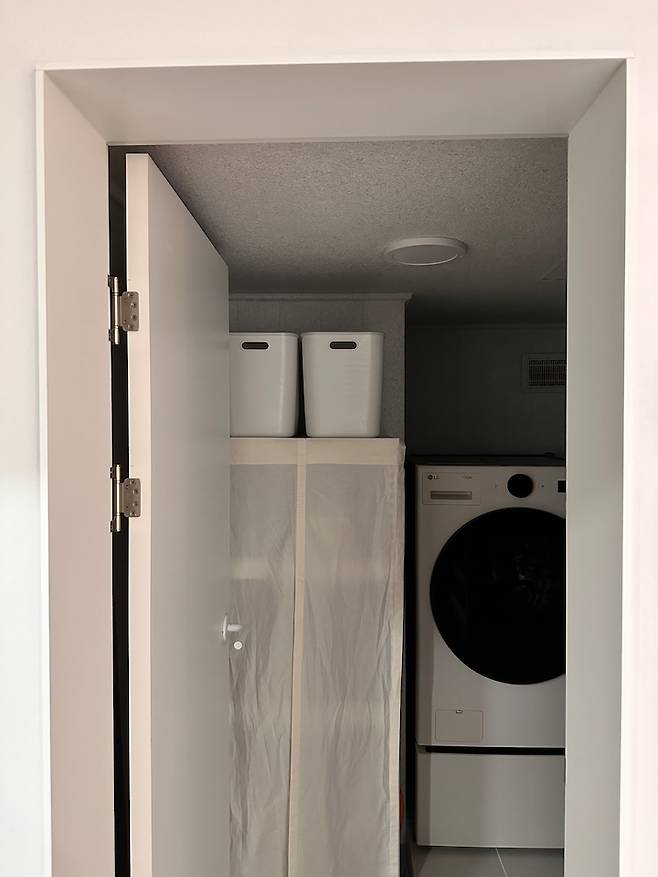 화장실 옆에 다용도실 공간이 있는데요. 이 공간은 비용 절감을 위해 힘을 뺀 공간입니다. 타일 철거 없이 탄성 코트로 마감하고 세탁실과 미니 창고로 이용하고 있습니다.
