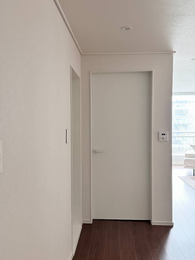 모든 방문의 손잡이도 흰색으로 달아줘서 시선에 걸리지 않도록 했어요. 덕분에 마루의 월넛 색상이 포인트가 되어서 만족스러워요.