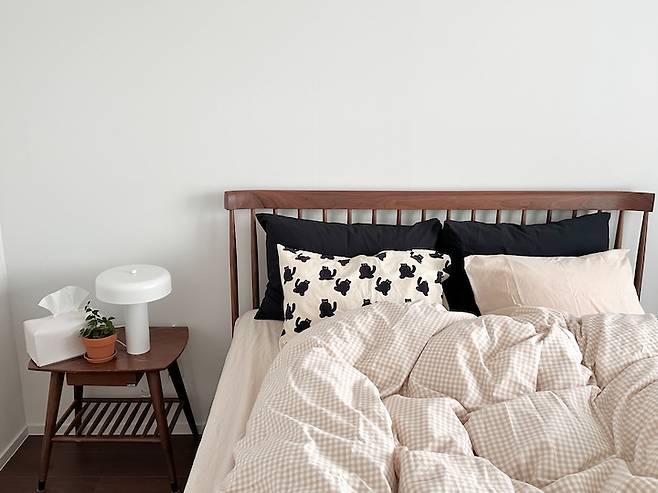 공간에 변화를 주면 긍정적인 에너지를 얻을 수 있는데 그 중에서 노력 대비 가장 큰 변화를 줄 수 있는 게 침구라고 생각해요. 요즘은 색감이 있고 빈티지 패턴의 베개 커버가 재미있어서 자주 사용하고 있습니다.