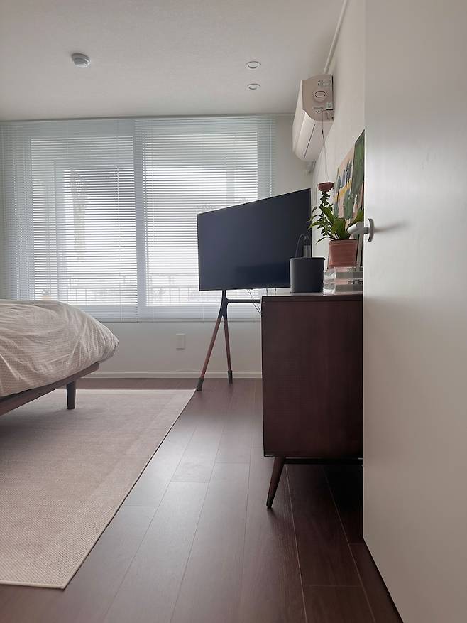 침대 맞은 편에는 짙은 색상의 원목 와이드 체스트와 티비를 두고 지내요.