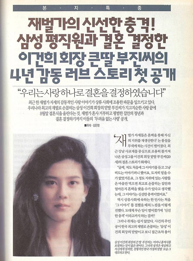 이부진 호텔신라 사장과 삼성 평직원 임우재 씨의 결혼 소식을 단독 보도했다. 재계의 이슈로 떠오른 이 결혼은 20년 후인 2019년 이혼으로 끝났다. 위자료는 141억 원대에 달했다.
