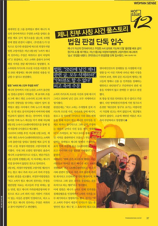 블랙핑크 제니는 자신을 친딸이라 주장한 A씨를 상대로 출판물 배포 금지 청구 소송을 제기했고, 법원은 "허위 주장"이라 판단했다. 해당 판결문을 단독 입수해 보도했으며, 이 뉴스는 해외 언론에서도 주목받았다.