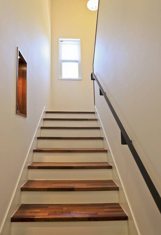 한편, 현관 앞에 배치한 게스트룸에는 재미있는 공간이 숨어 있다. 방 안에 작은 쪽문이 있는데 문을 열면 계단 아래 넓은 공간이 펼쳐진다. 영리한 공간 계획이 돋보이는 부분으로 향후 다양하게 활용할 수 있을 것으로 보인다. 가정한다면 서재로 꾸밀 수도 있다. 게스트룸에 단출하게 의자 하나만 놓아두고 쪽문을 통해 책을 꺼내 와 앉으면 혼자서 조용히 책을 읽을 수 있는 공간으로 변신할 것 같은 상상이다.