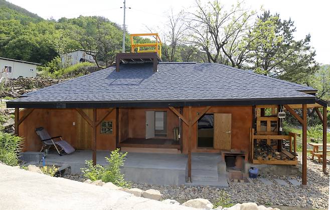서까래 아래 전통적인 마루가 있고 서까래를 연장해 처마를 더욱 넓게 확장했다. 이는 마루 앞 공간을 활용할 여지를 많게 하는 효과가 있다는 설명이다. 이외에도 뒤쪽으로 돌아가면 황토 미장이 돋보이는 벽면이 ‘一’자로 길게 펼쳐진 풍경을 감상할 수 있다. 더불어 본 집 박공지붕도 볼 수 있어 사진을 찍으면 두 집을 한 프레임에 담을 수 있다. 재미있는 부분은 시골집 지붕 위에도 여유를 즐기며 자연을 감상할 수 있는 작은 공간을 마련해 둔 것이다.