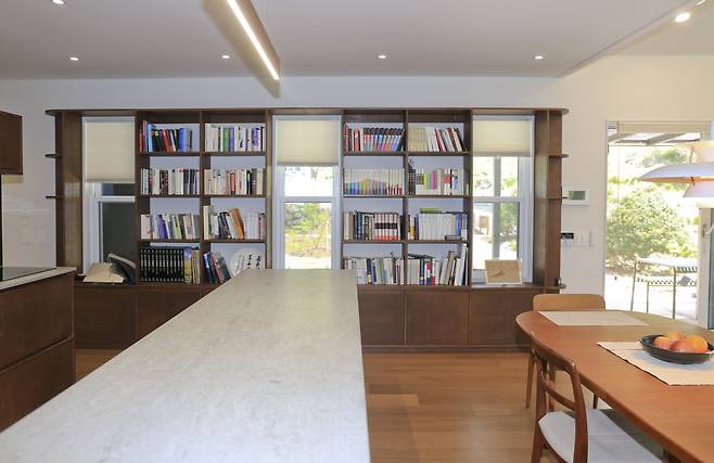 이 주택에서 빼놓을 수 없는 한 가지는 바로 책이다. 장서를 보유한 건축주가 설계 요청 시 중요하게 요청했던 것 중 하나는 책을 보관할 수 있는 충분한 공간을 마련하라는 것이었다. 공용공간인 1층은 주방-식당-거실을 일렬로 배치했고 한쪽 벽면은 책장으로 채웠다. 책을 꺼내 바로 거실 쇼파에 앉으면 창을 통해 펼쳐진 천연의 녹색을 감상하며 책을 읽을 수 있다. 독서를 하다 목이 마르거나 출출할 때는 바로 주방으로 이동해 간단한 다과를 즐길 수 있다.
