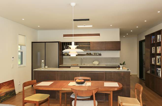 인테리어는 자연에서 온 재료를 위주로 사용했다. 거실 천장은 일부 편백나무로 마감했고 주방 싱크대, 아일랜드 테이블, 상부장 등은 모두 라왕원목합판으로 마련했다. 진한 브라운 톤과 약간 거친 듯한 질감은 주방의 편안한 분위기를 자아낸다. 특히 주방 인테리어가 의미 있는 이유는 디자인 관련 일을 하는 딸이 직접 설계했기 때문이다. 더불어 딸은 유럽풍의 깔끔하고 손이 덜 가는 자연의 느낌을 그대로 살린 정원을 직접 설계하기도 했다.