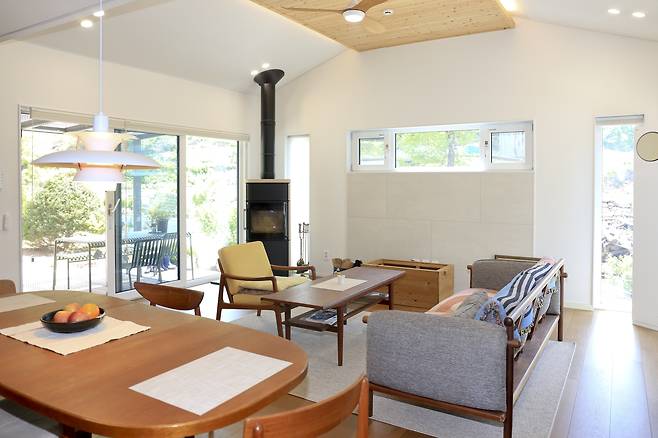 바로 앞에는 편백나무로 가벽 역할을 겸하는 침대 헤드를 만들어 효율적인 공간 활용을 이뤄냈다. 편백나무 가벽 앞의 커다란 창문을 아로새기는 새벽녘 별과 달은 침실의 내밀한 아름다움이라는 것이 건축주의 전언이다. 또한, 거실 벽난로는 건축주의 자연친화적인 삶을 대변하는 것으로 화석연료 사용을 최대한 자제하겠다는 의지가 담겨있다.