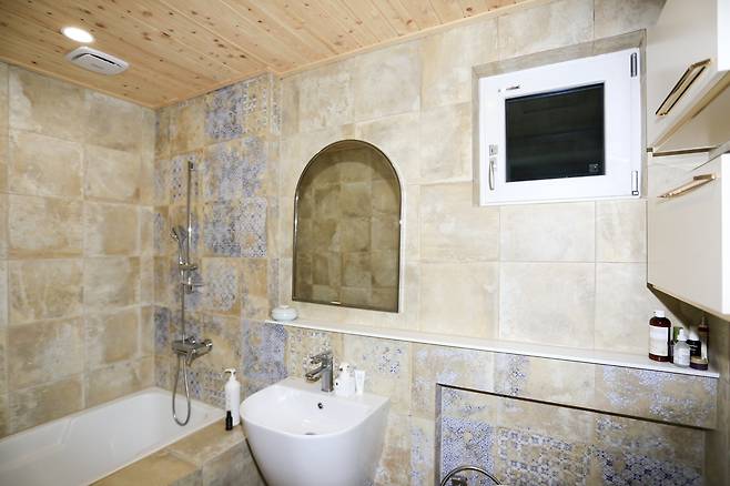 실크 벽지와 편백나무만을 사용한 천장과 벽면도 인상적이다. 바닥은 브라운 톤 오크 원목 마루로 통일했다. 욕실은 스페인산 빈티지 타일을 사용해 이국적이면서도 예스러운 분위기를 연출했다. 안방 드레스룸은 오픈 형태로 설계자의 아이디어가 돋보이는 대목이다. 벽면을 통째로 붙박이장으로 꾸밈으로써 마치 방 안의 복도 같은 착각을 일으키는 효과를 냈다.