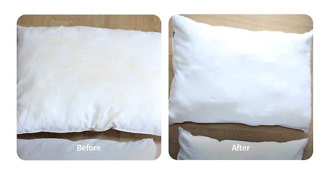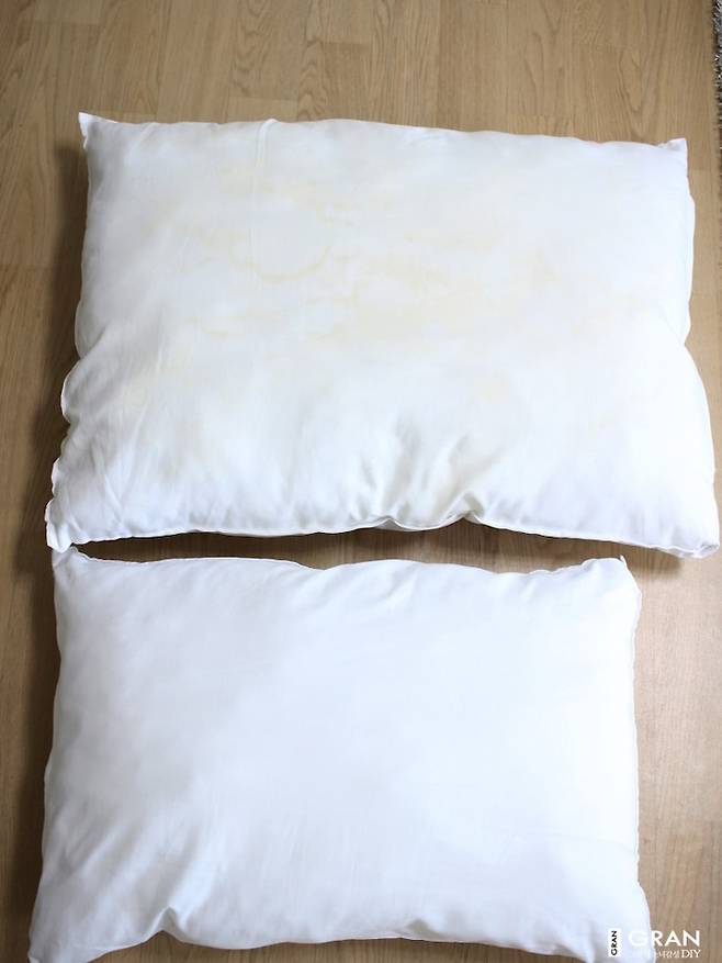 그동안 베개솜은 베개 커버만 벗겨 세탁하거나, 햇빛 좋을 때 베개 솜을 베란다에 두어 일광 소독했었는데 누렇게 된 부분이 돌아오진 않더라구요.