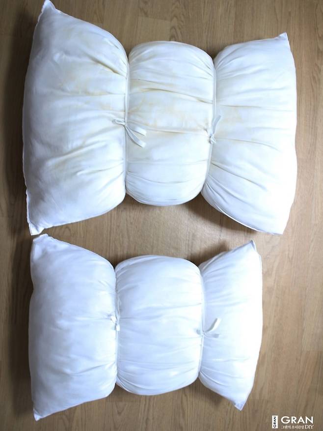 그 다음 베개가 3등분이 되도록 묶어주세요.