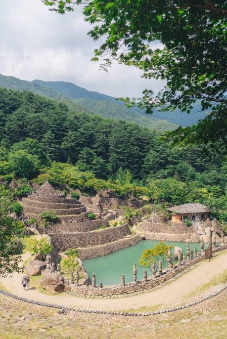 해발 850m에 자리한 삼성궁은 고조선시대의 소도를 복원하여 민족 성조인 환인, 환웅, 단군을 모시고 있는 공간입니다. 현재까지 홍익인간 정신으로 무예와 가, 무, 악을 수련하는 이들의 터전으로 알려져 있기도 한데요. 삼성궁 마고성 앞 옥빛의 청명한 호수를 둘러싼 돌탑들의 풍경이 이국적임을 넘어 신비로운 분위기까지 가득 품고 있습니다.