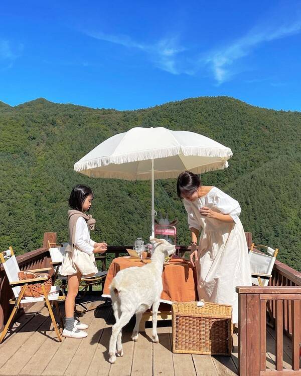 알프스의 하이디가 된 듯한 기분을 만끽할 수 있는 태백 몽토랑산양목장입니다. 시원한 고지대에 조성된 몽토랑 산양목장에서는 온순한 산양들이 들판을 자유롭게 뛰놀고 있어 자연스러운 교감을 나누기 좋은데요. 정상 카페 앞마당에는 울창한 산을 배경으로 그림같은 피크닉을 즐길 수 있도록 나무 데크가 설치되어 있습니다.