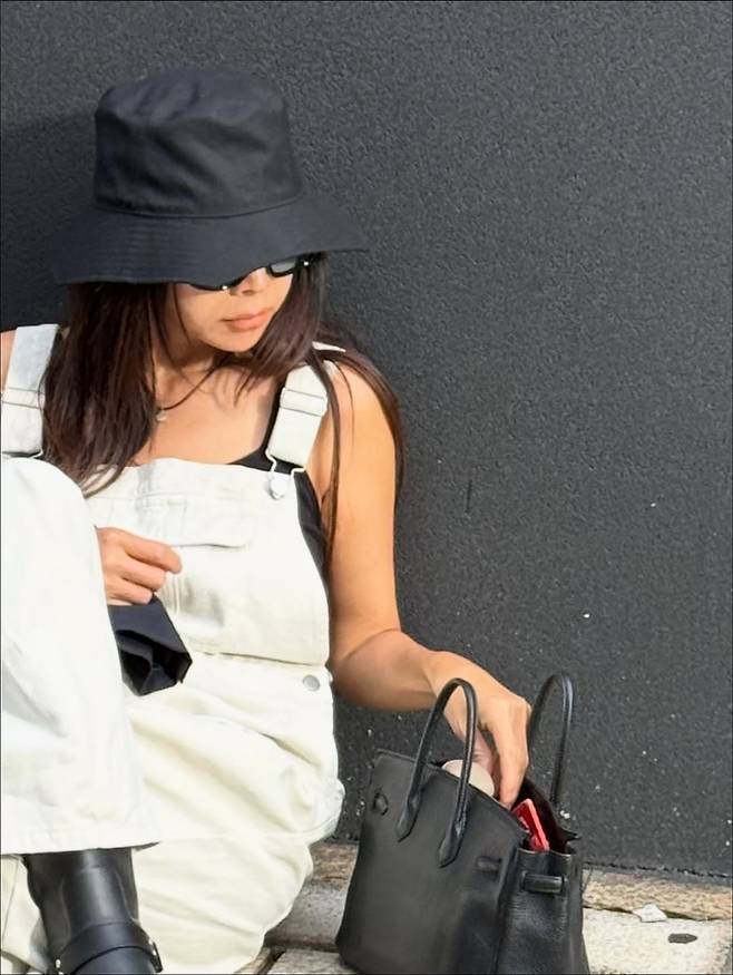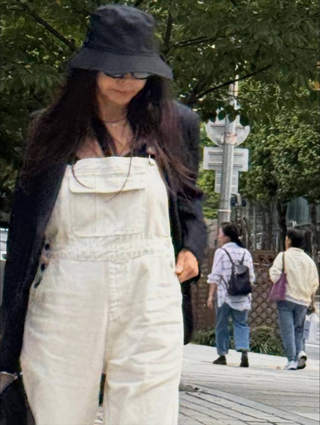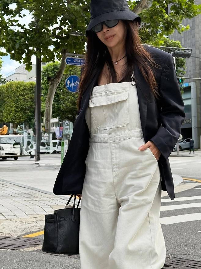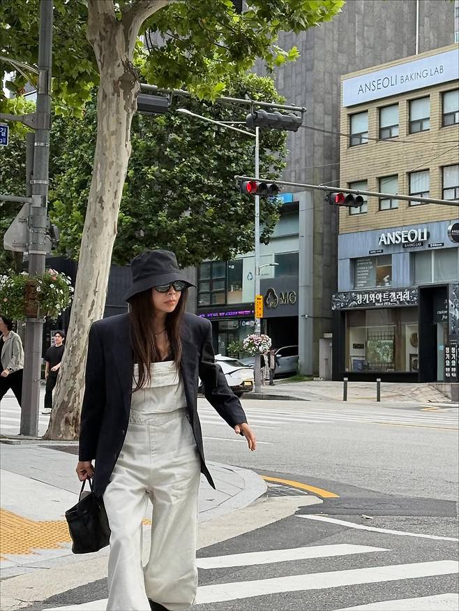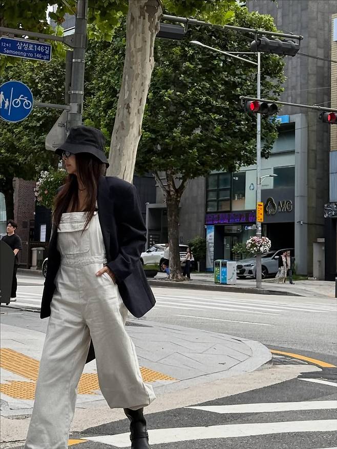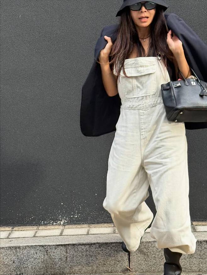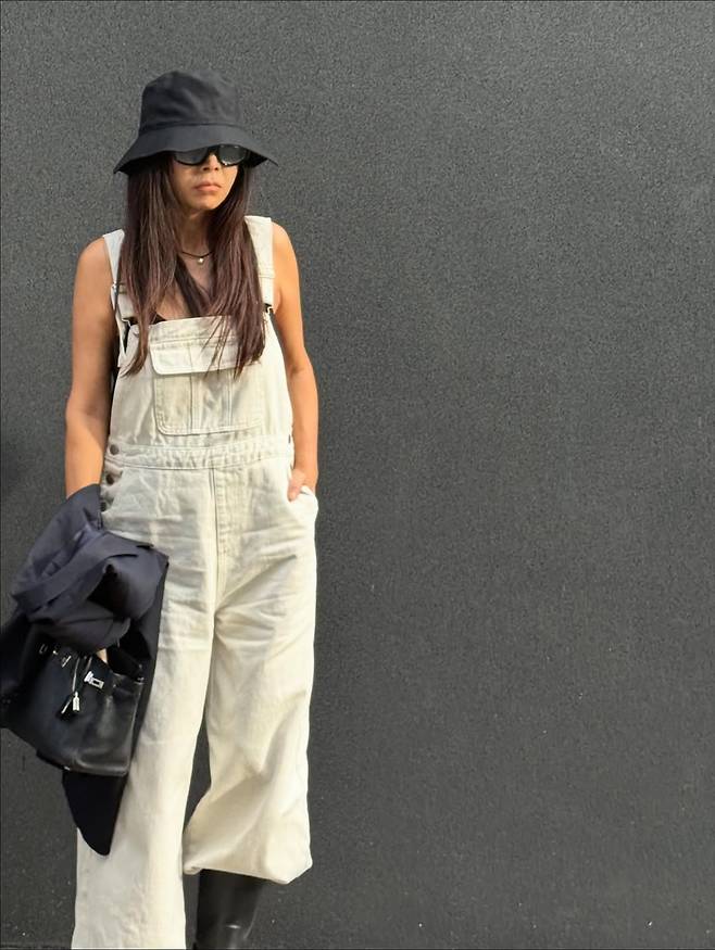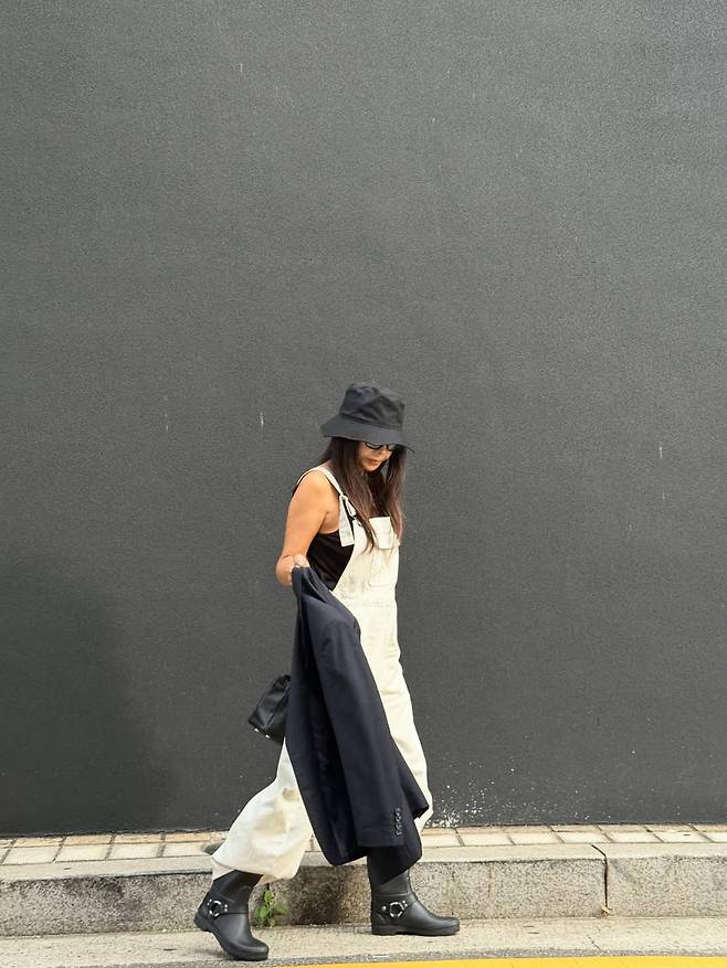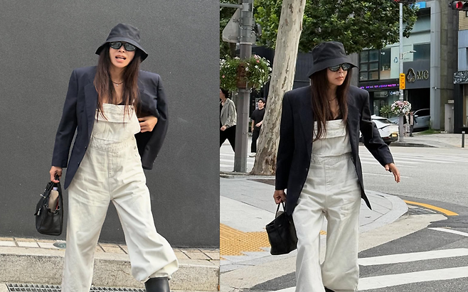 루즈핏 오버롤에 블랙 재킷을 걸쳐 멋을 냈습니다. 편안하면서도 시크한 가을 코디의 정석을 보여줬죠.