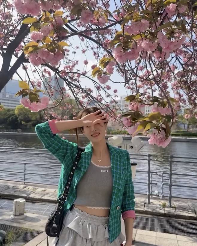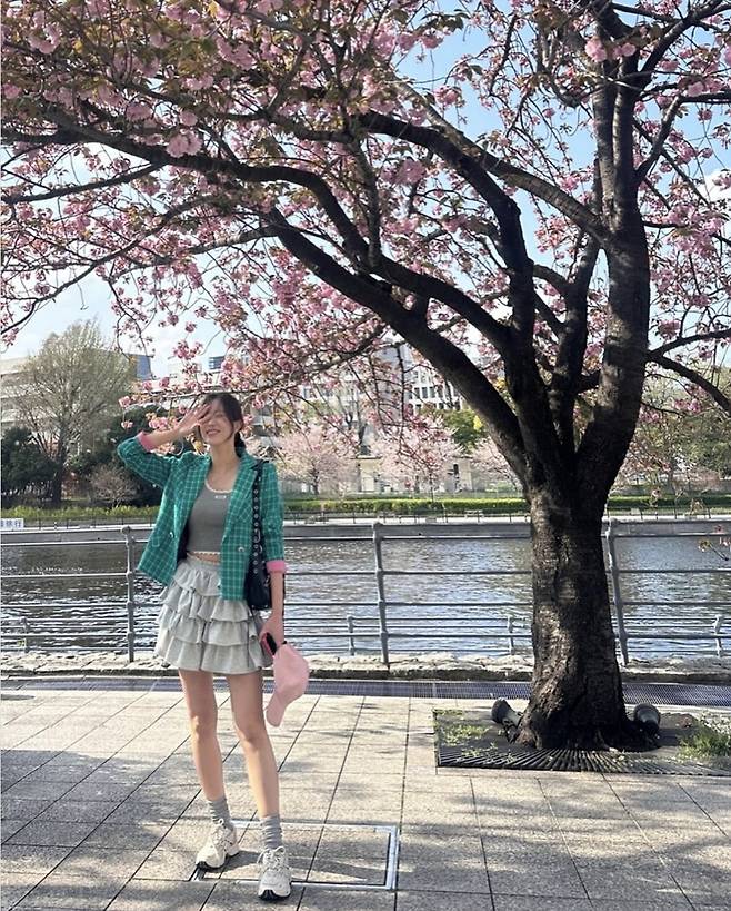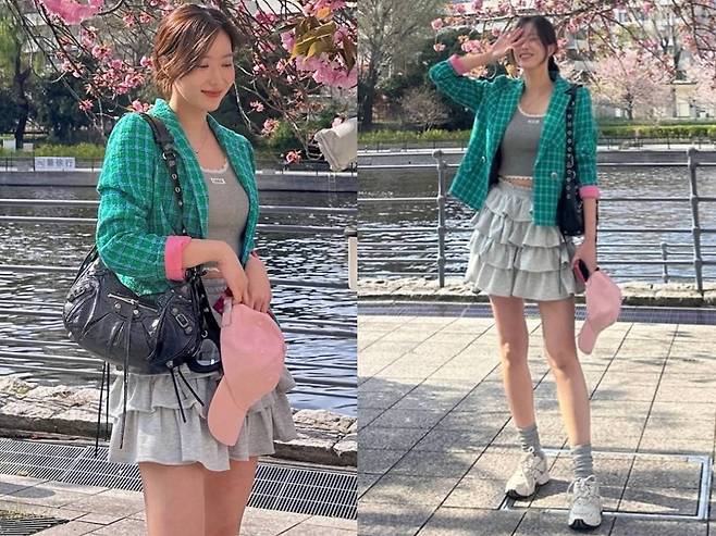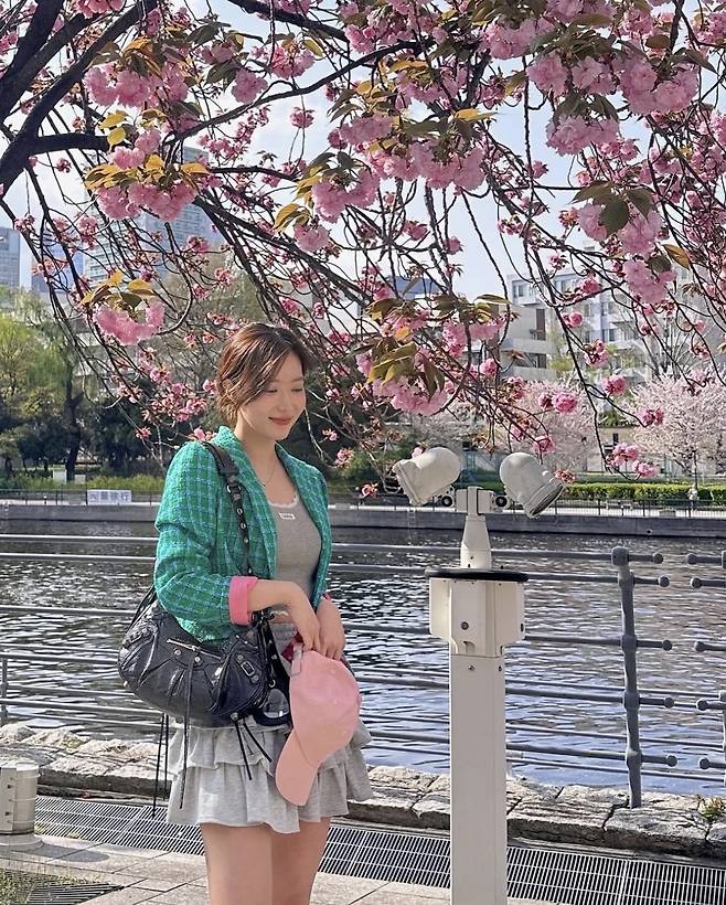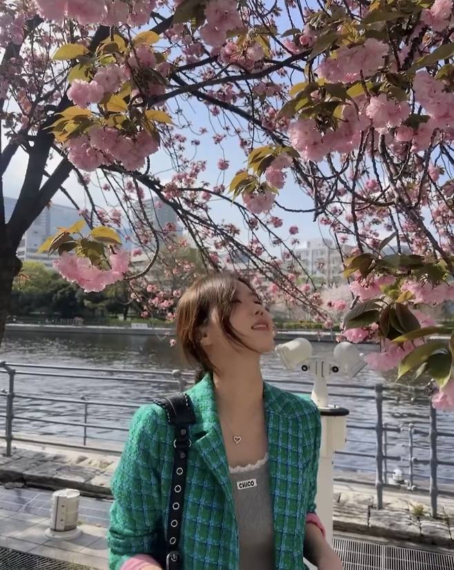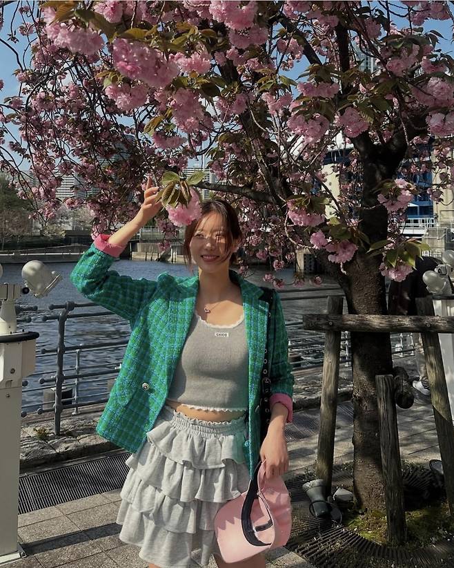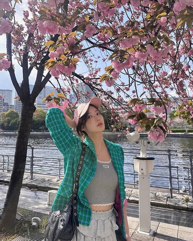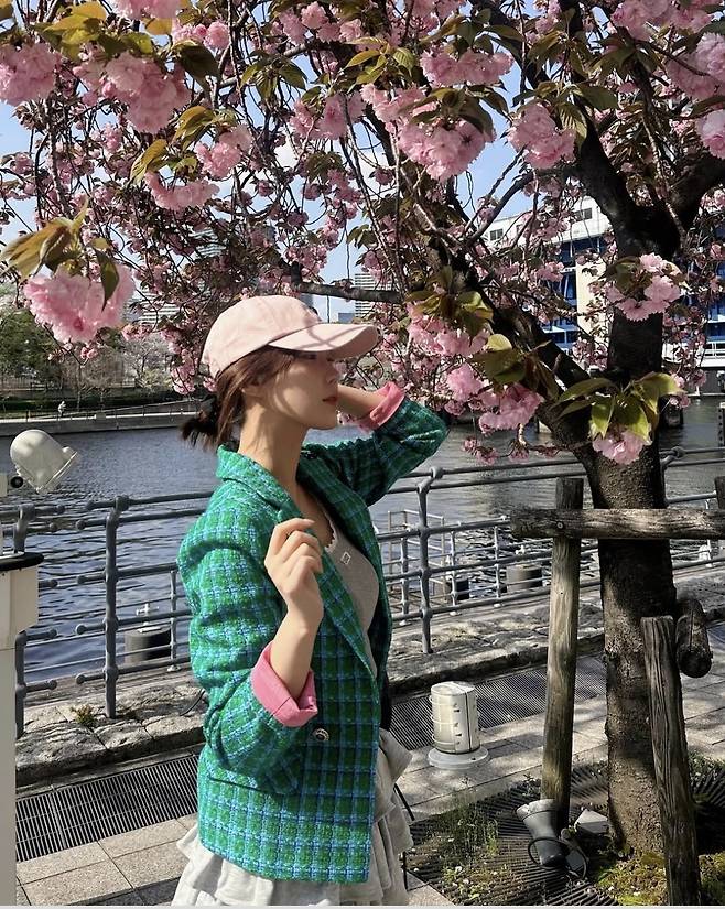 화사한 봄꽃 나무 아래서 포착된 임수향은 선명한 그린 컬러의 체크 패턴 재킷에 핑크 안감을 살짝 드러내며 생기 넘치는 매력을 발산했습니다.