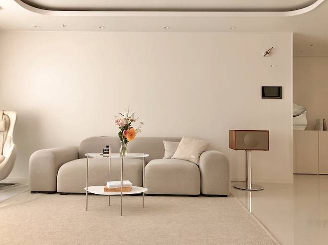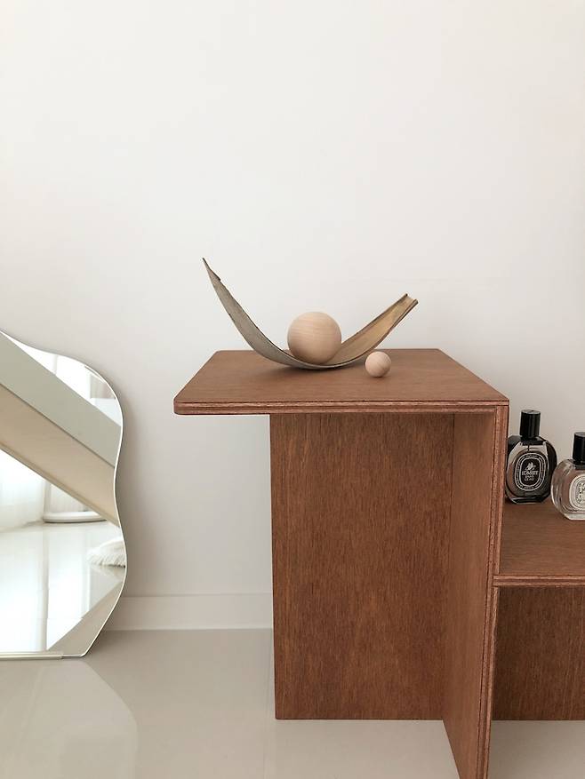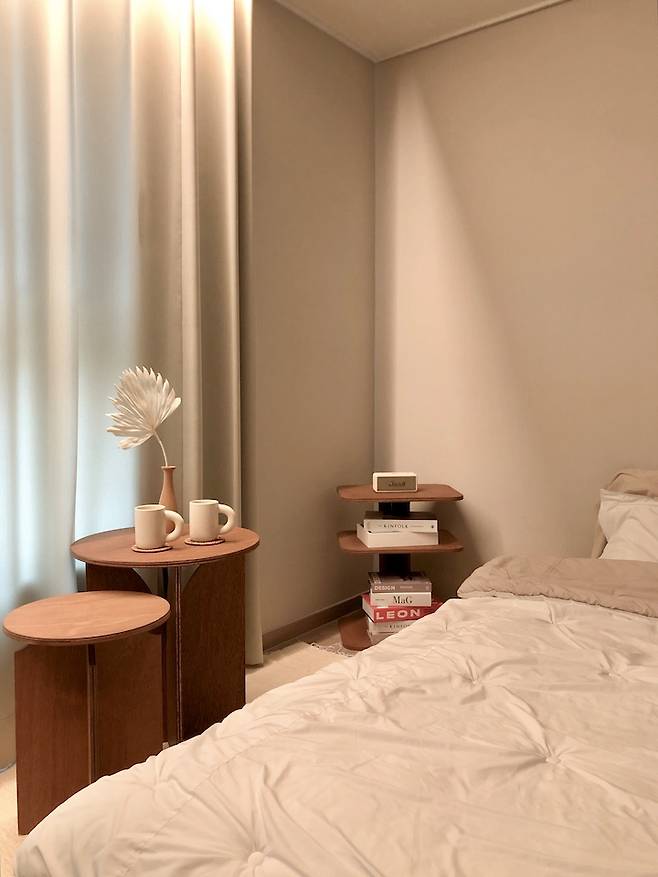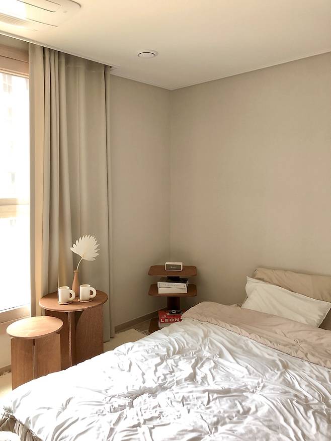 침실에는 좀 더 진한 누드톤의 가구들을 배치했어요. 자체 제작 가구로 사놓고 과연 이 가구들이 우리 집에 안 어울리면 어쩌지라는 생각을 제일 많이 한 거 같아요.