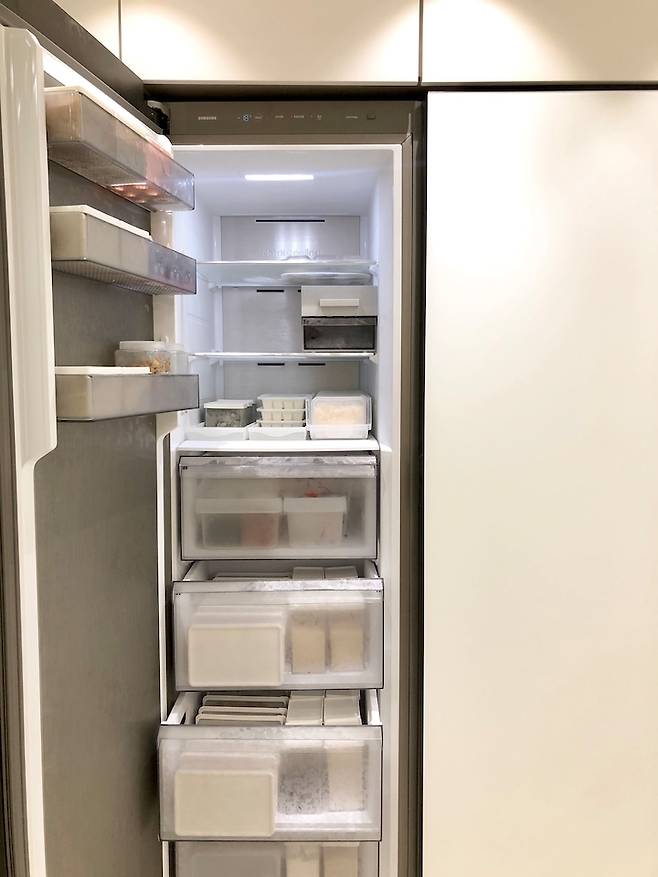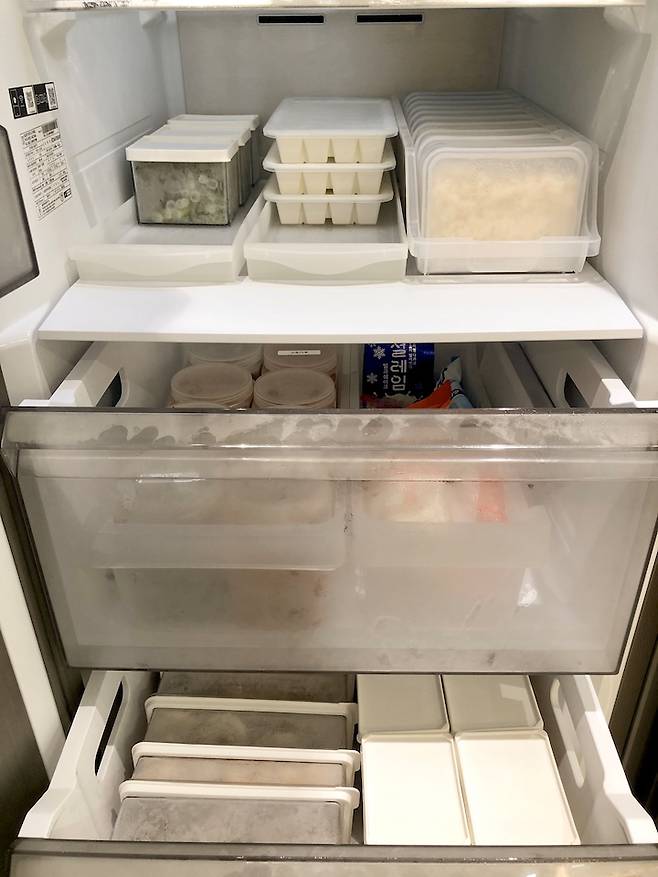 냉동실에는 한 달에 한 번 정도 냉동식품을 장을 봐서 소분해서 넣어둬요. 저희가 먹는 냉동식품 칸, 아이가 먹는 냉동식품 칸, 육류 칸으로 나뉘어 보관하고 옆쪽에는 잡곡류와 쌀을 2인분 3인분으로 나뉘어 넣어둬요.