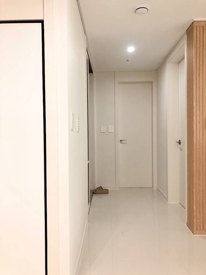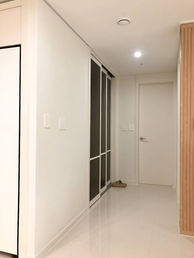 중문이 기본 옵션 중 하나였는데 색상이 맞지 않아 중문을 교체할까 생각하다 하얀 시트지 시공을 하였는데 시트지 작업만으로도 충분히 만족했던 부분이에요.
